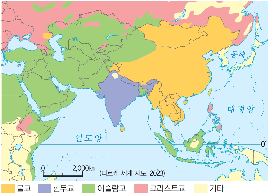- 아시아의 다양한 종교: 아시아는 불교, 힌두교, 이슬람교, 크리스트교 등 세계 주요 종교의 발상지로, 매우 다양한 종교가 공존하는 대륙입니다. 불교와 힌두교는 인도 북부에서 기원하였으며, 이슬람교와 크리스트교는 서남아시아 지역에서 발생하였습니다. 아시아는 지역 간의 거리가 가까움에도 불구하고, 종교 경관과 생활 양식이 크게 다를 만큼 종교 분포가 지역별로 다양하게 나타납니다.