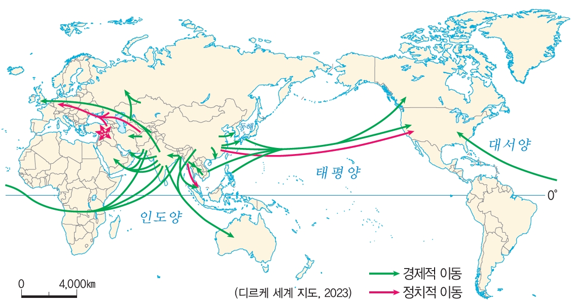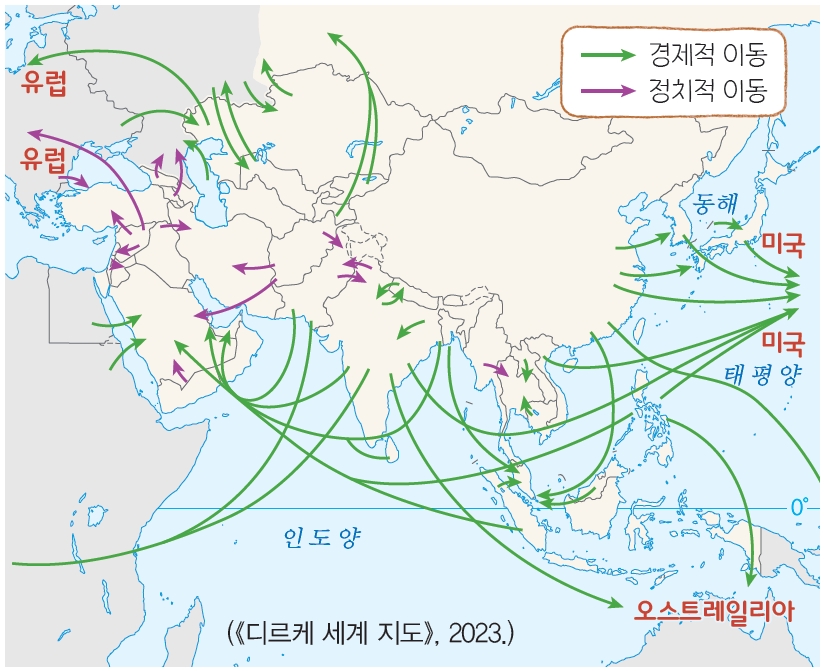 - 아시아의 인구 이주: 서남아시아의 사우디아라비아, 아랍 에미리트 등은 석유 개발로 얻은 경제적 이익을 신도시 건설, 고층 빌딩 건설 등 대규모 개발 사업에 투자하고 있어 일자리가 풍부합니다. 따라서 방글라데시, 인도, 파키스탄 등 주변 아시아 국가에서 일자리를 찾는 젊은 남성 노동자들이 서남아시아로 유입되고 있습니다.