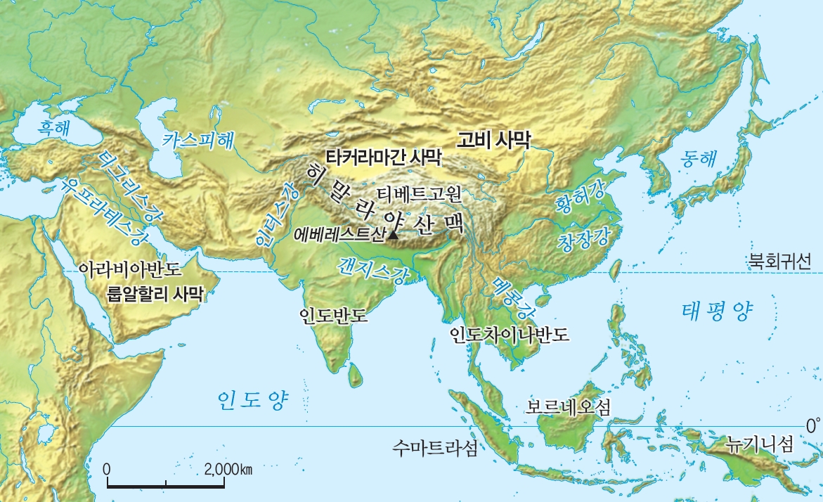 - 아시아의 지형 특징: 아시아는 알프스-히말라야 조산대의 영향을 받아 히말라야산맥과 티베트고원과 같은 높은 산지와 고원이 발달해 있습니다. 이러한 지역에서 발원한 티그리스강, 유프라테스강, 인더스강, 갠지스강, 메콩강, 황허강 등 주요 하천은 넓은 평야 지대를 지나 바다로 흘러갑니다. 이러한 하천 유역의 평야 지대는 토양이 비옥하고 물이 풍부해 농경이 일찍부터 발달했으며, 이는 문명의 중심지가 형성되는 데 중요한 역할을 했습니다. 반면, 강수량이 적은 유라시아 대륙의 내륙 지역과 아라비아반도에는 고비 사막과 룹알할리 사막과 같은 대규모 사막 지대가 나타납니다.