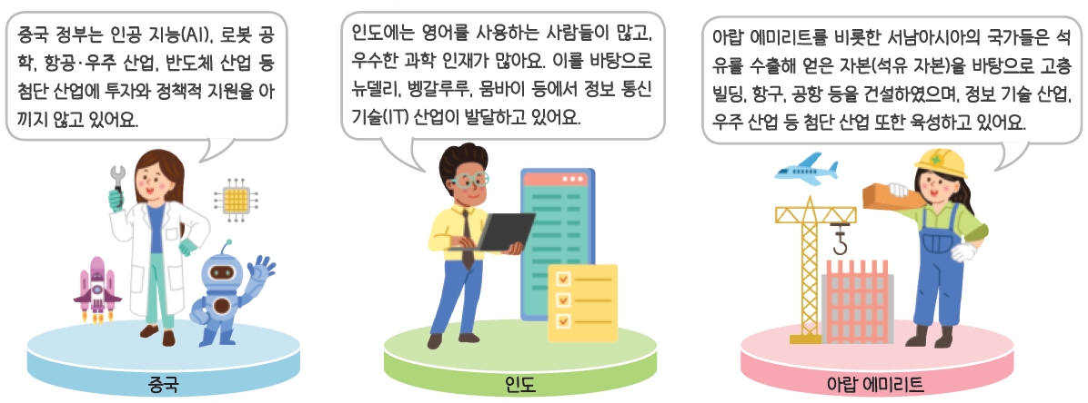 - 서비스업과 첨단 산업 발달: 최근 대한민국, 인도, 일본, 중국 등에서는 부가 가치가 높은 서비스업과 첨단 산업이 발달하였습니다. 서남아시아의 일부 국가도 석유 자본을 바탕으로 첨단 산업과 관광 산업 육성하고 있습니다.