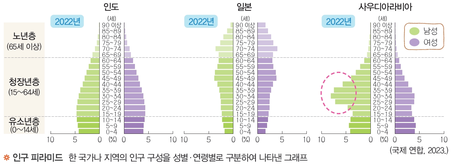 - 아시아의 인구 구조: 파키스탄, 필리핀 등 합계 출산율이 높게 나타나는 국가들은 기대 수명 증가와 함께 인구가 빠르게 증가하고 있습니다. 반면, 대한민국, 일본 등 경제 발전 수준이 높은 아시아의 국가에서는 결혼과 자녀에 대한 가치관의 변화, 고용 환경의 변화 등으로 태어나는 아이의 수가 줄어드는 저출산이 나타나고 있습니다. 이들 국가에서는 인구 증가율이 감소하는 한편, 전체 인구에서 65세 이상의 노년층 인구가 차지하는 비율이 높아지는 고령화도 나타나고 있습니다.