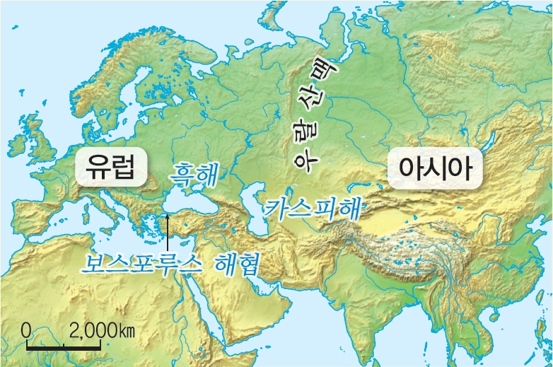 - 아시아의 경계: 일반적으로 러시아에 남북으로 길게 뻗은 우랄산맥에서 시작하여 카스피해와 흑해, 보스포루스 해협을 연결한 선을 기준으로 두 지역을 구분합니다. 보통 우랄산맥 동쪽을 아시아, 우랄산맥 서쪽을 유럽이라고 부릅니다.