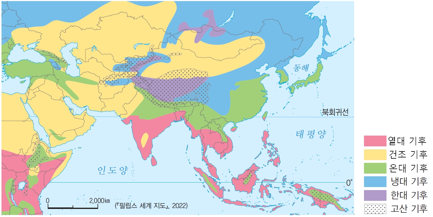 - 아시아의 기후 특징: 아시아는 위도, 지형, 해발 고도 등의 차이에 따라 매우 다양한 기후를 보입니다. 중국 북동부 지역은 냉대 기후, 중국 중남부와 일본, 동남아시아 북부 지역은 온대 기후, 동남아시아 중남부와 인도 남부 지역은 열대 기후가 나타납니다. 서남아시아와 중앙아시아는 사막과 초원이 펼쳐진 건조 기후가 특징입니다.