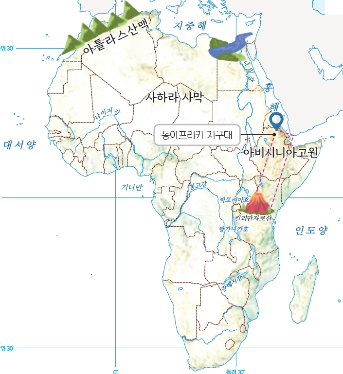 | 동아프리카 지구대 | 판이 갈라지고 있으며, 동아프리카 지구대를 따라 킬리만자로산, 케냐산 등이 발달함. |
