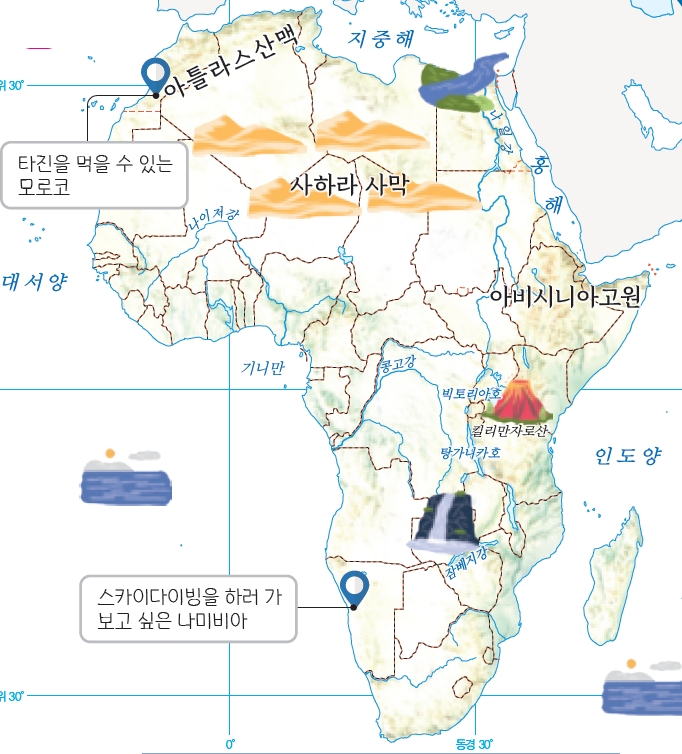 알려져 있고, 남부의 남아프리카 공화국은 아프리카에서 최초로 월드컵을 개최하였습니다. 동부의 케냐와 탄자니아에는 야생 동물을 볼 수 있는 국립 공원이 유명하고, 서부의 세네갈은 대서양을 통해 활발한 무역을 하며 성장하였습니다. 섬 국가인 마다가스카르는 여우원숭이, 바오바브나무와 같은 독특한 동식물의 서식지로 잘 알려져 있습니다.