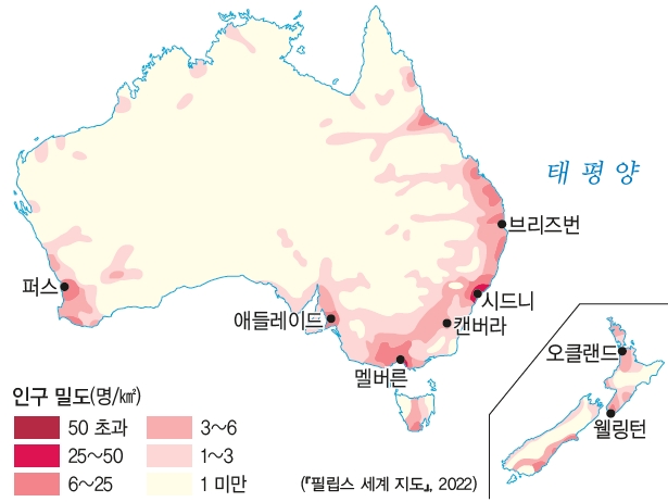 오스트레일리아의 주요 도시로는 인구가 가장 많은 시드니, 계획도시인 수도 캔버라 등이 있다. 뉴질랜드의 주요 도시로는 인구가 가장 많은 오클랜드, 수도인 웰링턴 등이 있다. 오스트레일리아와 뉴질랜드는 영국 연방으로, 온대 기후 지역에 살던 영국인들이 개척한 것도 온대 기후 지역의 인구 밀도가 높은 것에 영향을 주었다.