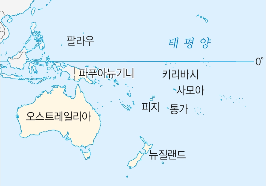 오세아니아의 국가와 도시 오세아니아에서 국토 면적이 가장 넓은 국가는 오스트레일리아이다. 이웃 국가로는 북섬과 남섬으로 이루어진 뉴질랜드, 인도네시아와 맞닿아 있는 파푸아 뉴기니 등이 있다. 태평양에는 솔로몬 제도, 피지, 바누아투, 투발루, 나우루와 같은 작은 섬 국가들이 있다.