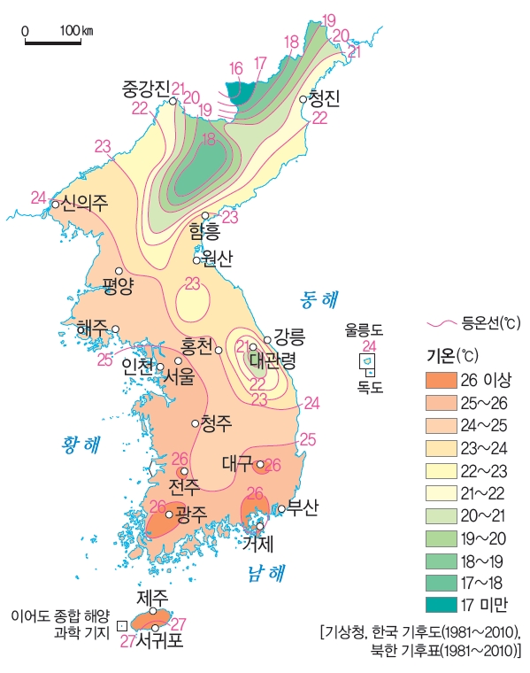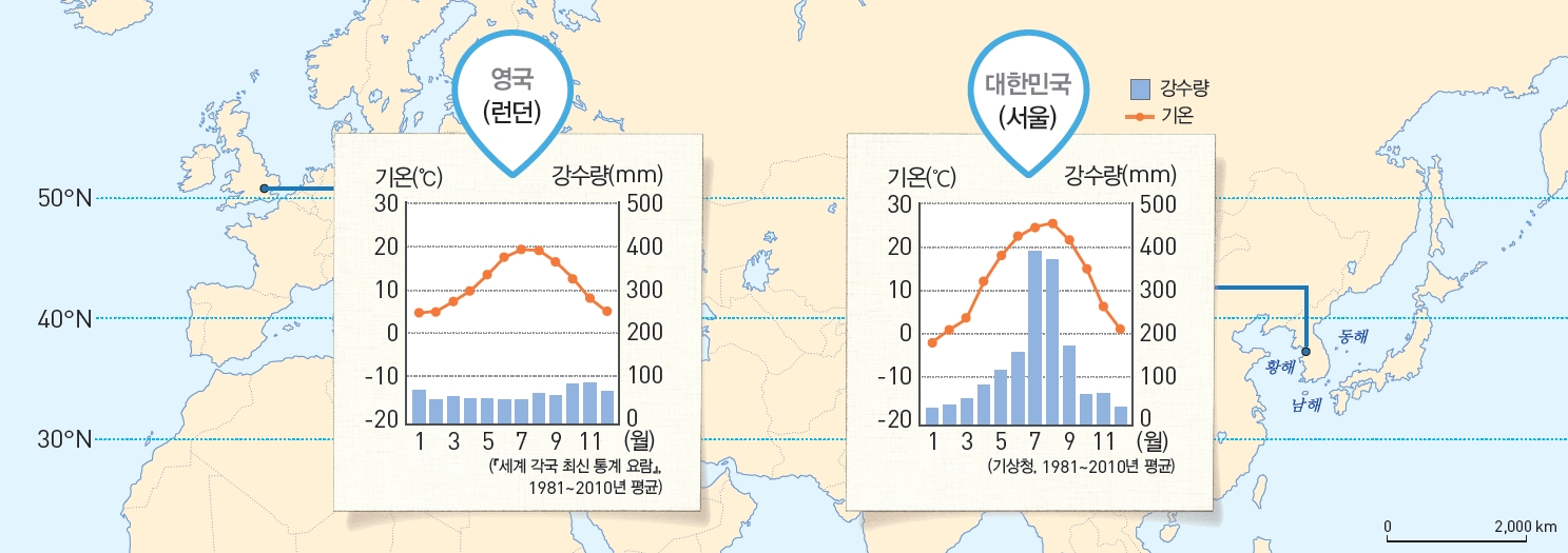 강릉과 인천은 비슷한 위도대에 위치하지만, 강릉의 1월 평균 기온이 인천보다 더 높다. 동해안에 있는 강릉과 서해안에 있는 인천의 기온 차이는 해양과 해류가 서로 다르게 영향을 미치기 때문이다. 동해의 해수면 온도가 황해보다 겨울철에 상대적으로 높아서 여름보다 겨울철에 두 지역의 기온 차이가 더 크다.
