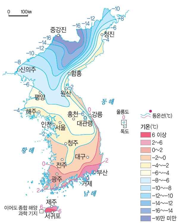북부 내륙 지방은 대륙의 영향을 받아 빠르게 냉각된 시베리아 기단이 확장하면서 겨울철 평균 기온이 -15℃ 내외까지 떨어지지만, 제주도를 비롯한 남부 지방은 상대적으로 따뜻한 바다와 인접하여 겨울에도 대부분 영상의 기온을 유지한다. 겨울은 최한월 평균 기온이 -16~6℃ 정도로 지역에 따라 약 22℃의 차이가 나며, 북부 내륙 지방에 위치한 중강진은 우리나라에서 기온이 가장 낮은 지역이다.