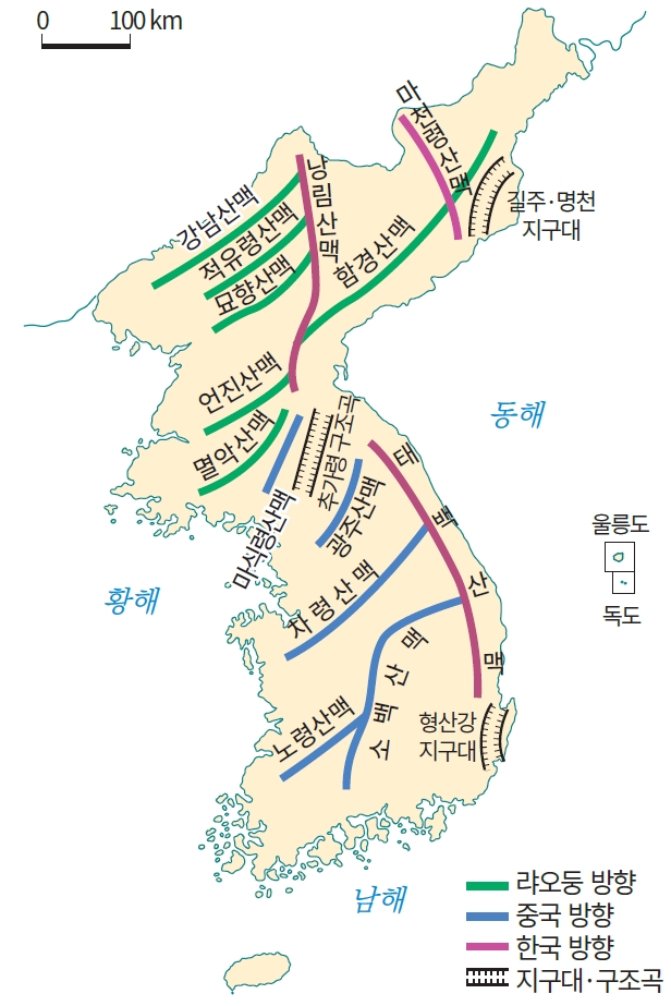 우리나라의 산맥은 방향에 따라 랴오둥 방향(동북동~서남서) 산맥과 중국 방향(북동~남서) 산맥, 낭림산맥과 태백산맥이 속한 한국 방향(북북서~남남동) 산맥으로 나눌 수 있습니다.