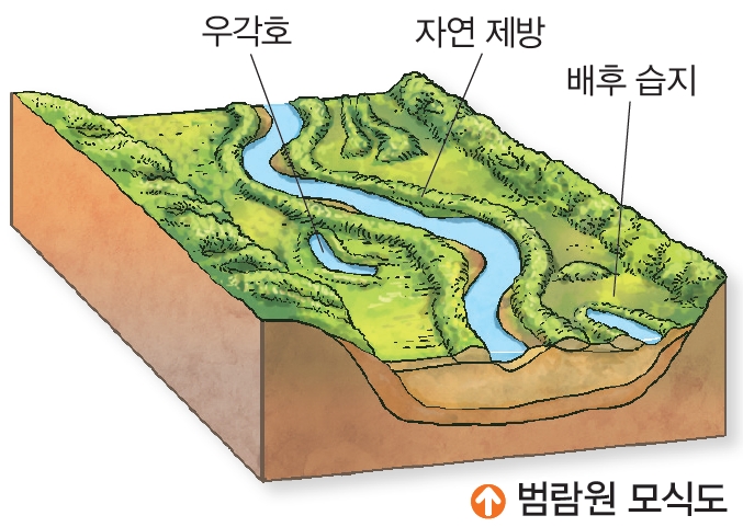 (3) 하천 중·하류에 발달하는 지형(자유 곡류 하천, 범람원, 삼각주)