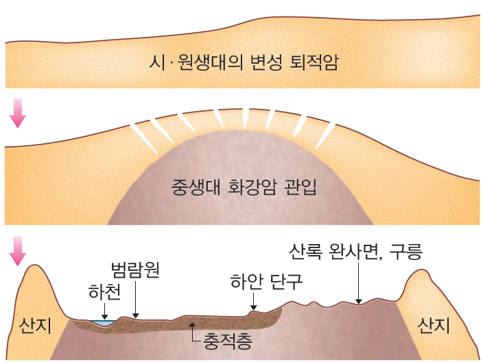 침식 분지의 발달 과정 시·원생대에 형성된 편마암이 기반암을 이루는 곳에 중생대 화강암이 관입한 이후, 화강암이 편마암보다 빠르게 침식을 받아 중앙부가 깊게 파여서 형성되었다.