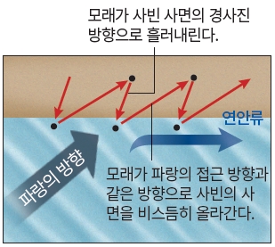 - 연안류: 해안을 따라 평행하게 이동하는 바닷물의 흐름으로, 곶에서 침식된 물질이나 하천에서 공급된 모래와 자갈을 운반하여 퇴적 지형을 형성한다.