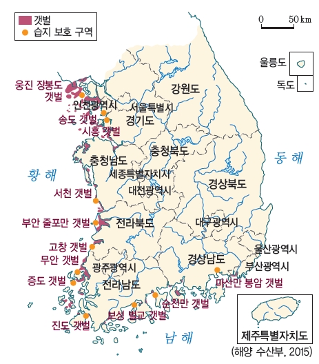 서·남해안은 조수 간만의 차가 크고, 파랑의 작용이 크지 않고, 하천에서 공급된 점토와 같은 퇴적물의 양이 많아 졾에 의한 퇴적 작용이 우세해 갯벌이 잘 발달한다. 갯벌은 조차가 크고 파랑이 약하며 바닷속의 경사가 비교적 완만한 해안에 잘 발달한다. 우리나라의 서 · 남해안은 이러한 조건을 갖추고 있어 갯벌이 넓게 발달하며 세계 5대 갯벌 가운데 하나로 꼽힌다.