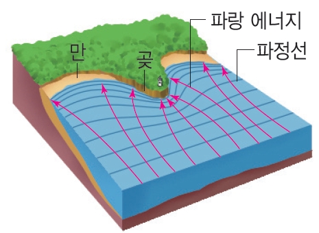 곶에서는 파랑의 침식 작용이 활발하여 암석 해안이 발달한다.