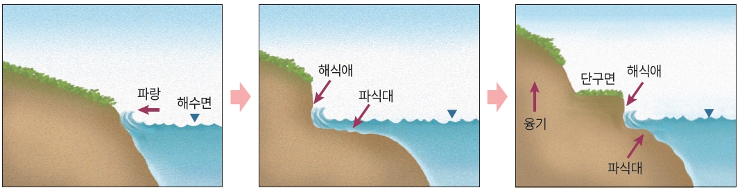 암석 해안에는 해안 침식 지형인 해식애, 해식동이 발달하고, 그 전면에는 평평한 파식대가 형성된다.