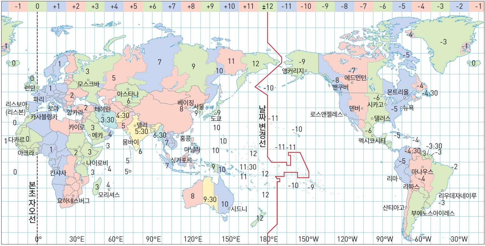 세계 각국은 자국의 표준 경선을 정해 해당 경선의 시각을 표준시로 사용하고 있습니다. 우리나라의 표준 경선은 동경 135°로, 이는 본초 자오선이 지나는 영국보다 9시간 빠른 표준시를 사용함을 의미합니다.