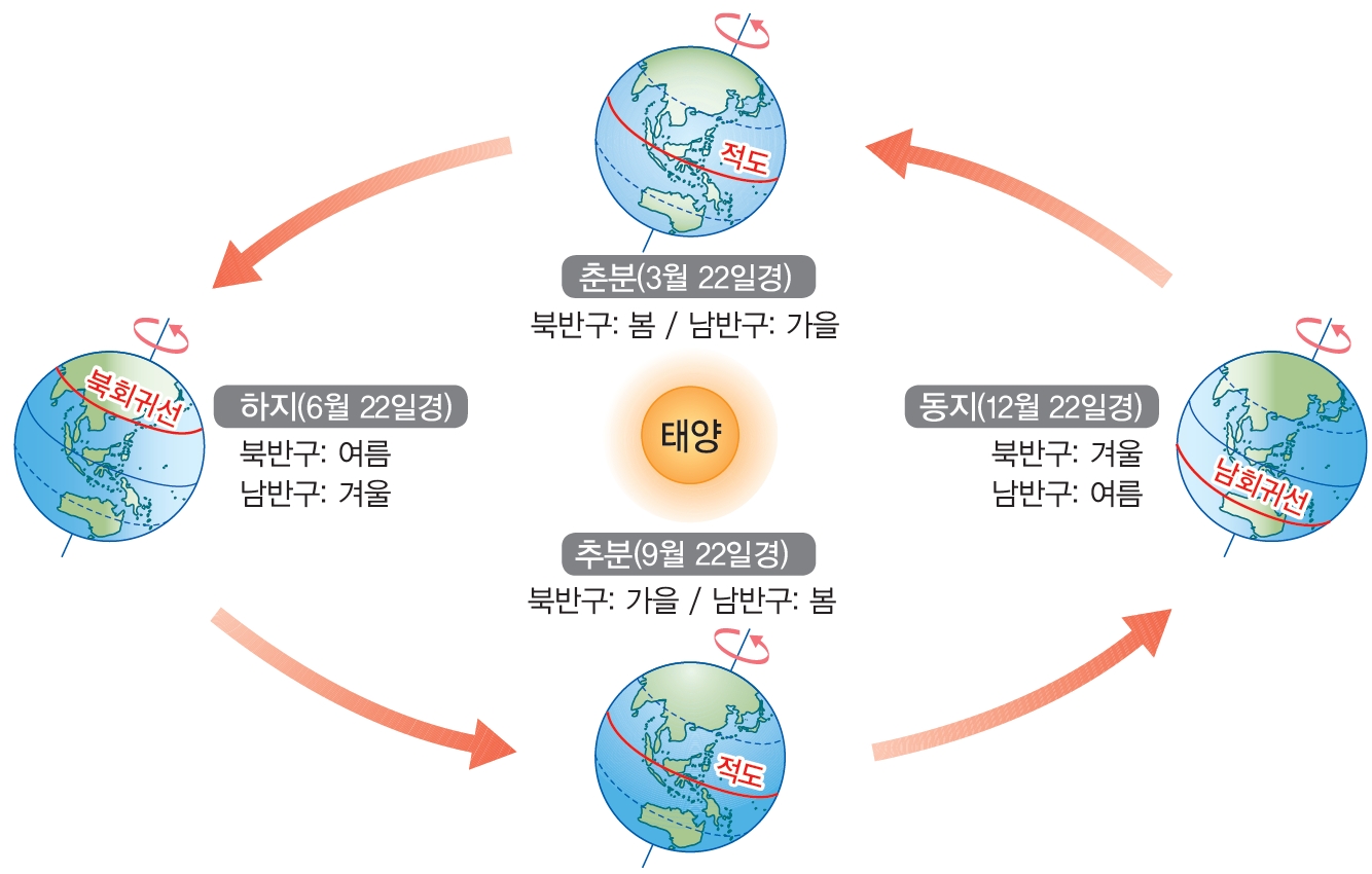 지구는 약 23.5° 기울어진 상태로 공전하기 때문에 북반구와 남반구의 중위도 지역에서는 계절이 서로 반대로 나타납니다. 북반구는 태양 에너지를 많이 받는 6월에서 8월 사이에 여름이 되고, 남반구는 같은 시기에 태양 에너지를 적게 받아 겨울이 됩니다.