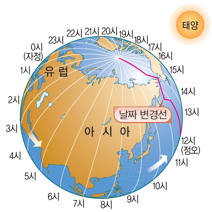 지구는 하루에 한 번 서쪽에서 동쪽으로 회전하며, 이를 자전이라고 합니다. 지구의 자전으로 인해 경도에 따라 시간이 달라지며, 지구는 24시간 동안 360°를 회전하므로 경도 15°마다 한 시간의 시차가 발생합니다. 표준시는 영국의 그리니치 천문대를 지나는 경선인 본초 자오선(0°)을 기준으로 동쪽으로 갈수록 빨라지고, 서쪽으로 갈수록 늦어집니다. 본초 자오선의 반대편인 동경 180°선과 서경 180°선이 만나는 곳은 날짜 변경선이라고 합니다.