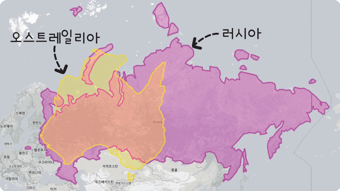 🔹 러시아가 오스트레일리아보다 훨씬 커 보이지만, 실제로는 러시아의 약 절반 크기입니다.
