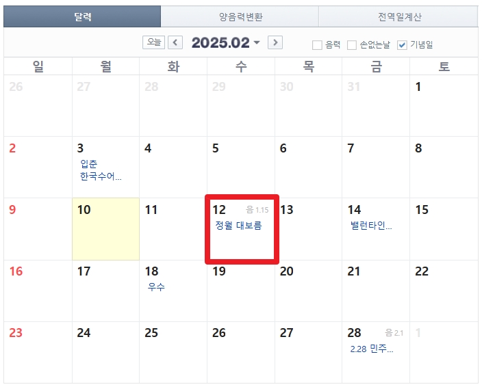 2025년 올해의 정월대보름은 양력으로 2월 12일 수요일입니다.